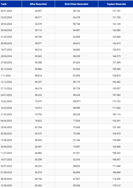 Türkiye Cumhuriyet Merkez Bankası (TCMB) toplam rezervleri, 15 Ağustos haftasında bir önceki haftaya göre 2 milyar 145 milyon dolar artışla 176 milyar 510 milyon dolara çıkarak tüm zamanların en yüksek seviyesine ulaştı.