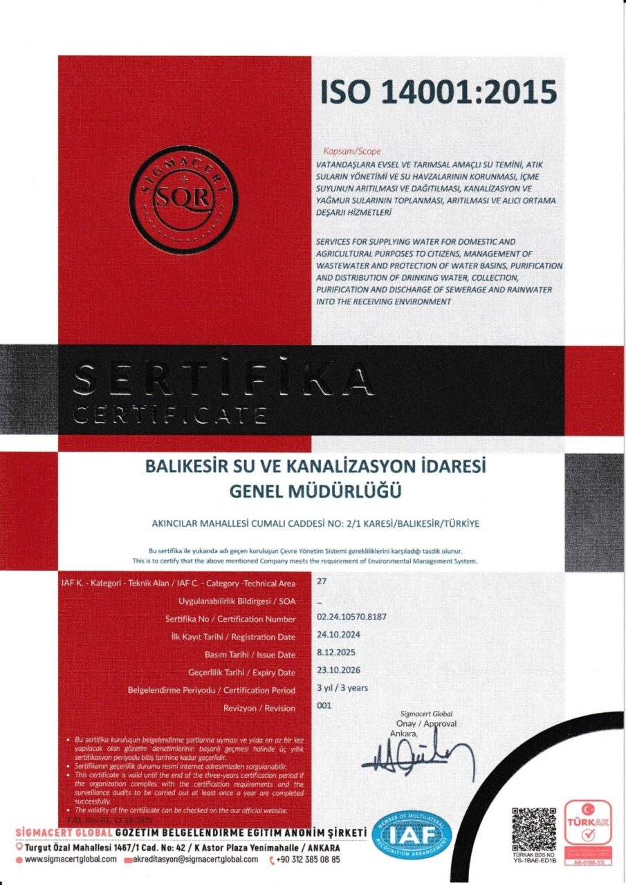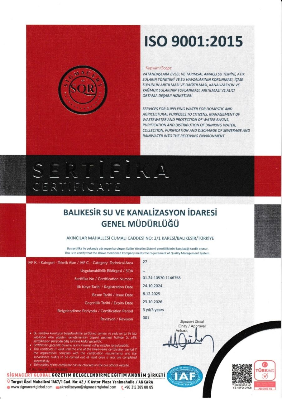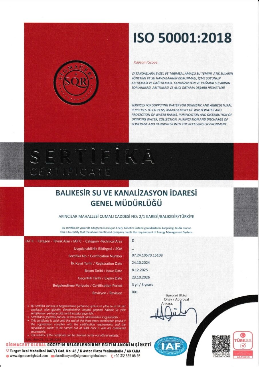 Balıkesir Büyükşehir Belediyesine bağlı Balıkesir Su ve Kanalizasyon İdaresi (BASKİ) Genel Müdürlüğü, vatandaş memnuniyetinden enerji verimliliğine kadar her alanda uluslararası standartlara uygun olarak yürüttüğü çalışmalarla ISO Entegre Yönetim Sistemleri kapsamında gerçekleşen dış denetimi sorunsuz geçti. BASKİ, bünyesinde bulunan ISO 9001 Kalite Yönetim Sistemi, ISO 14001 Çevre Yönetim Sistemi, ISO 50001 Enerji Yönetim Sistemi ve ISO 45001 İş Sağlığı ve Güvenliği Yönetim Sistemi belgelerini korumayı başardı. Balıkesir Büyükşehir Belediye Başkanı Ahmet Akın’ın liderliğinde BASKİ Genel Müdürlüğü tarafından içme suyu temini, su kaynaklarının korunması, atık suların güvenli şekilde bertaraf edilmesi, enerji kullanımının verimli yönetilmesi ve iş sağlığı ile güvenliği alanında en yüksek düzeyde önlemlerin alınması için çalışmalar aralıksız sürdürülüyor. BASKİ, tüm bu süreçlerde vatandaş memnuniyetini ve toplumun ihtiyaçlarını en üst seviyede karşılamayı hedefliyor.