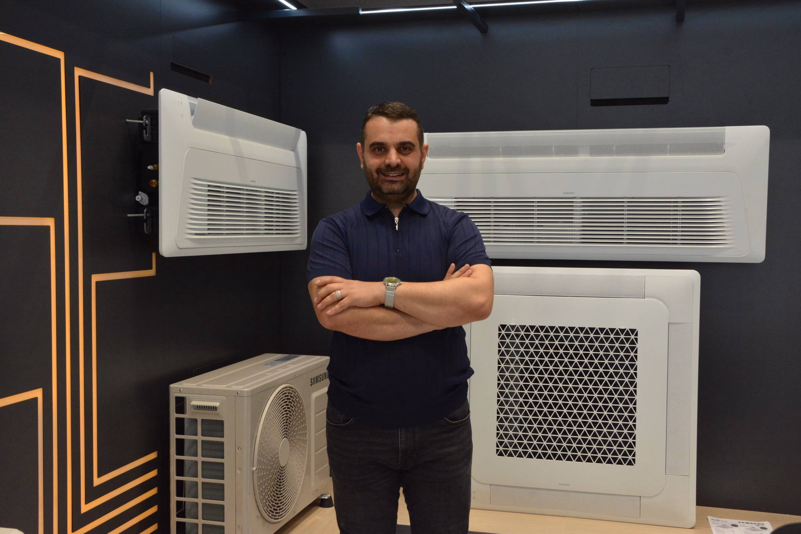 Showroomda sadece ev tipi klimalar değil; iş yerleri için 360 derece üfleme kapasiteli kaset tipi klimalar, oteller için tek yönlü modeller, villalar için multi sistemler ve doğalgazın olmadığı bölgeler için ısı pompaları da yer alıyor.
